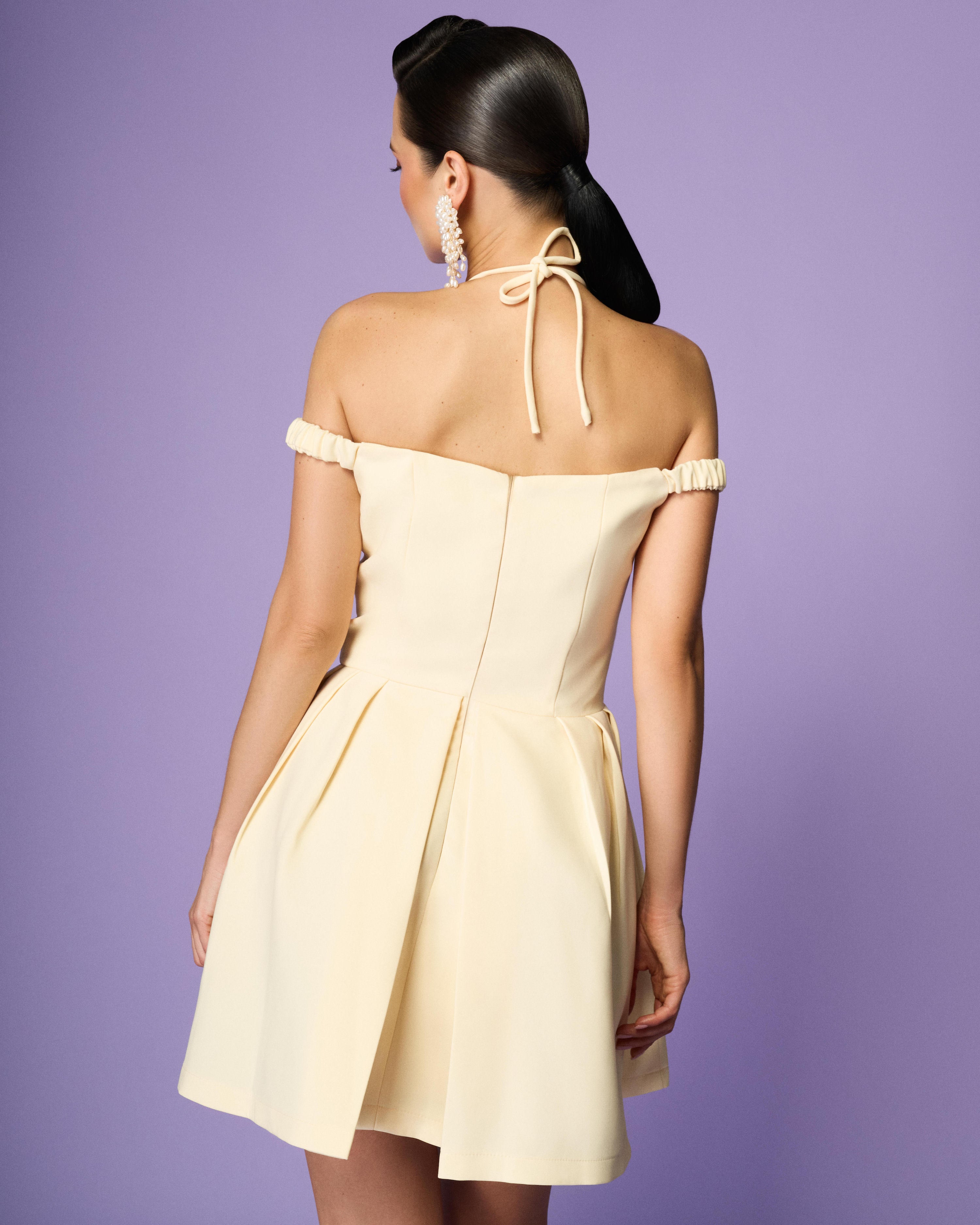 Turn heads and steal hearts with this delightful buttercream yellow dress that's as sweet as a summer day. The halter neckline and off-the-shoulder straps add a flirtatious touch, while the charming cutout at the bust gives a playful peekaboo effect. The skirt flares out with just the right amount of volume, creating a whimsical silhouette perfect for dancing and twirling. Embellished with delicate detailing, this dress is a perfect blend of vintage glamour and modern fun.
