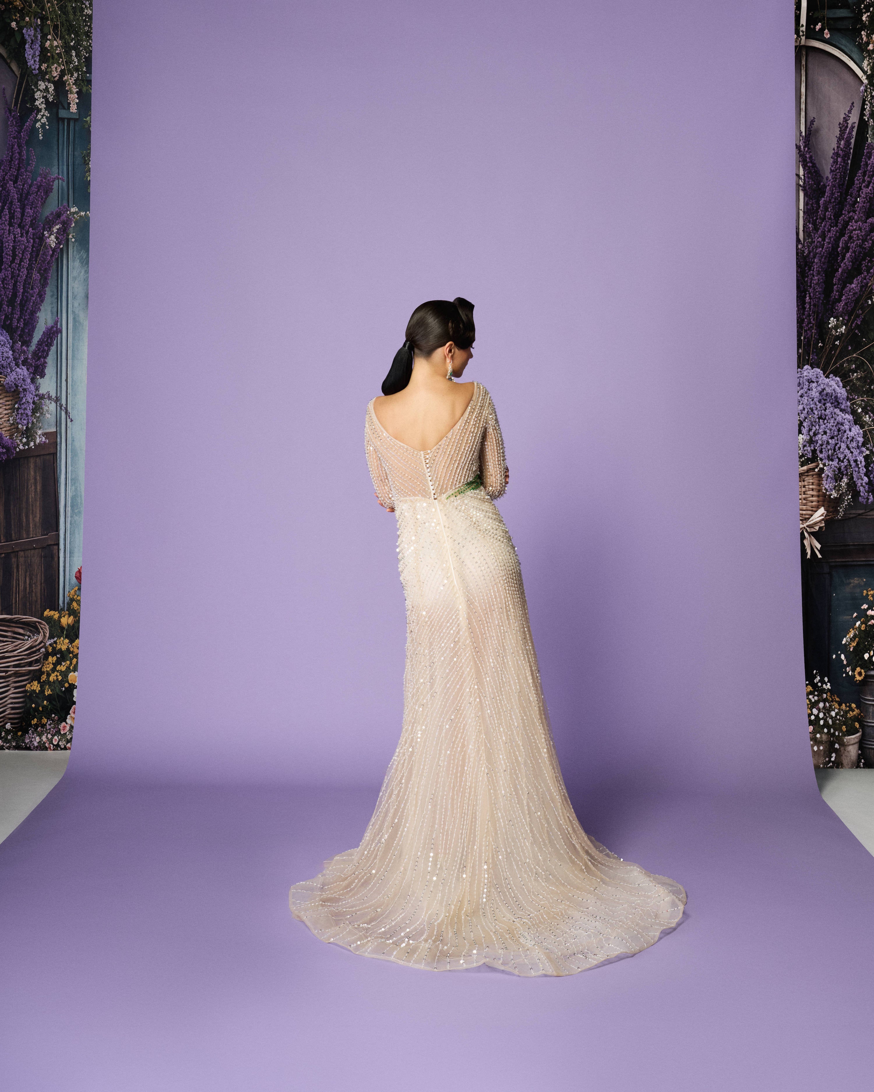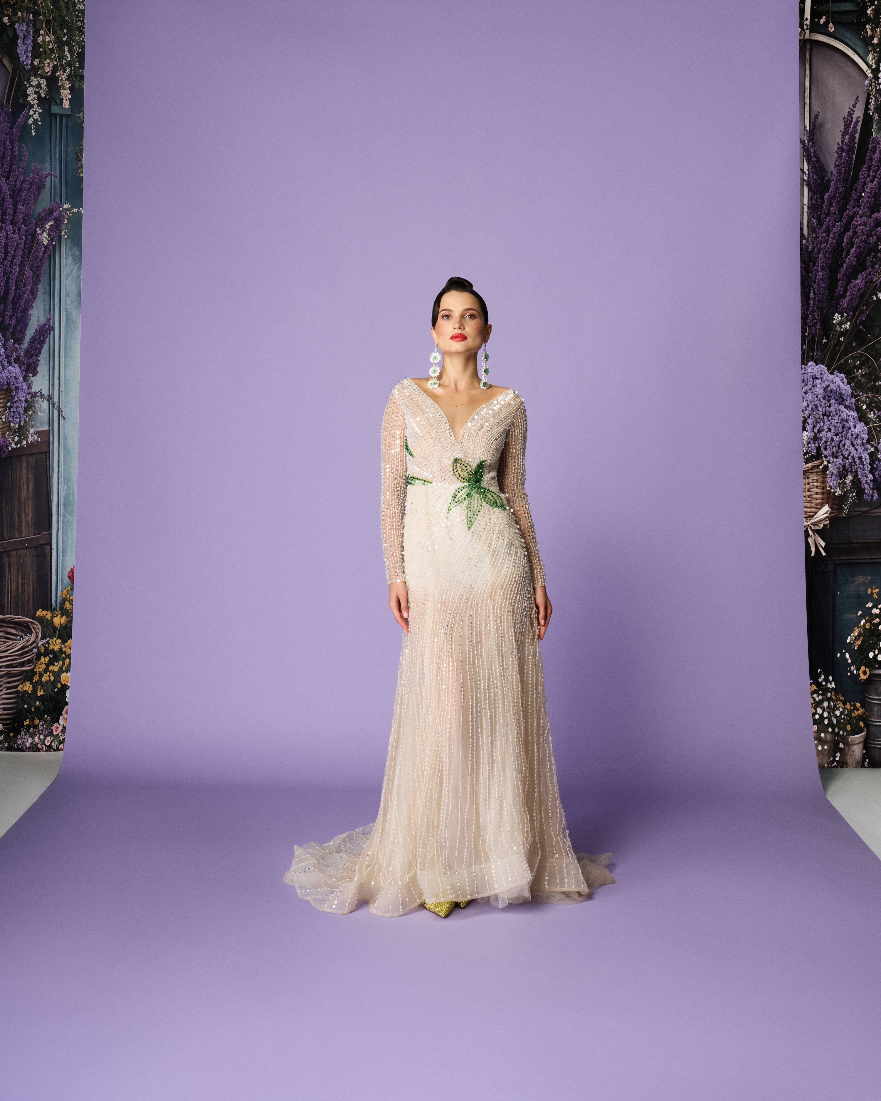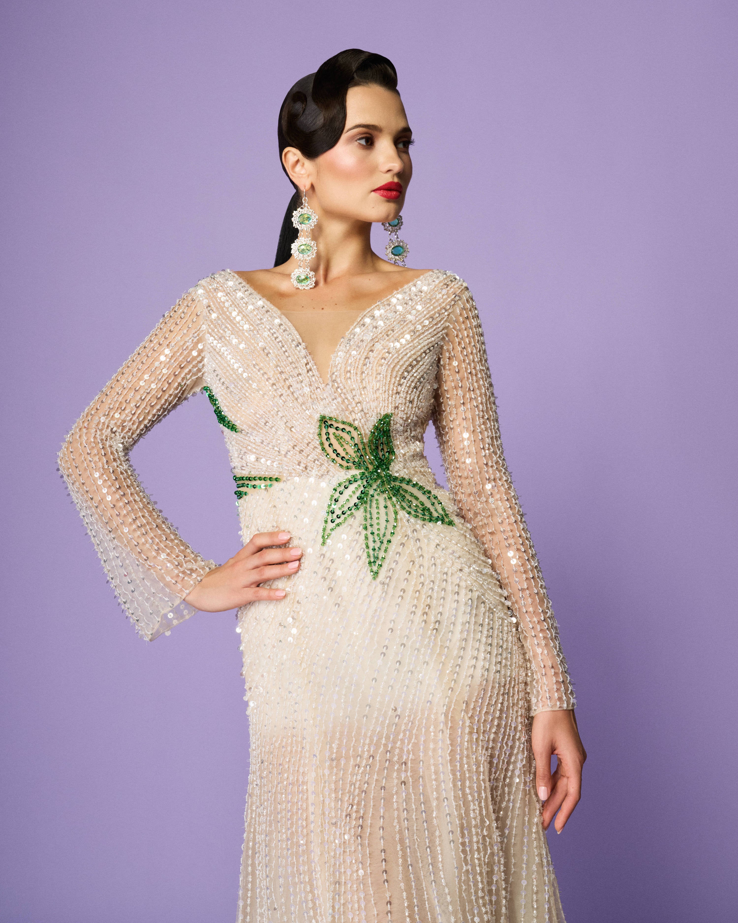 Step into a world of shimmering enchantment with this exquisite handmade beaded gown that promises to make you feel like a starlet on the red carpet. The sheer, long sleeves and plunging neckline add a touch of daring elegance, while the intricate beadwork cascades down the dress like a waterfall of twinkling stars. Highlighted by a stunning green leaf motif, this gown merges natural beauty with high fashion. The figure-hugging silhouette and the ethereal, flowing skirt create a mesmerizing effect with every step you take