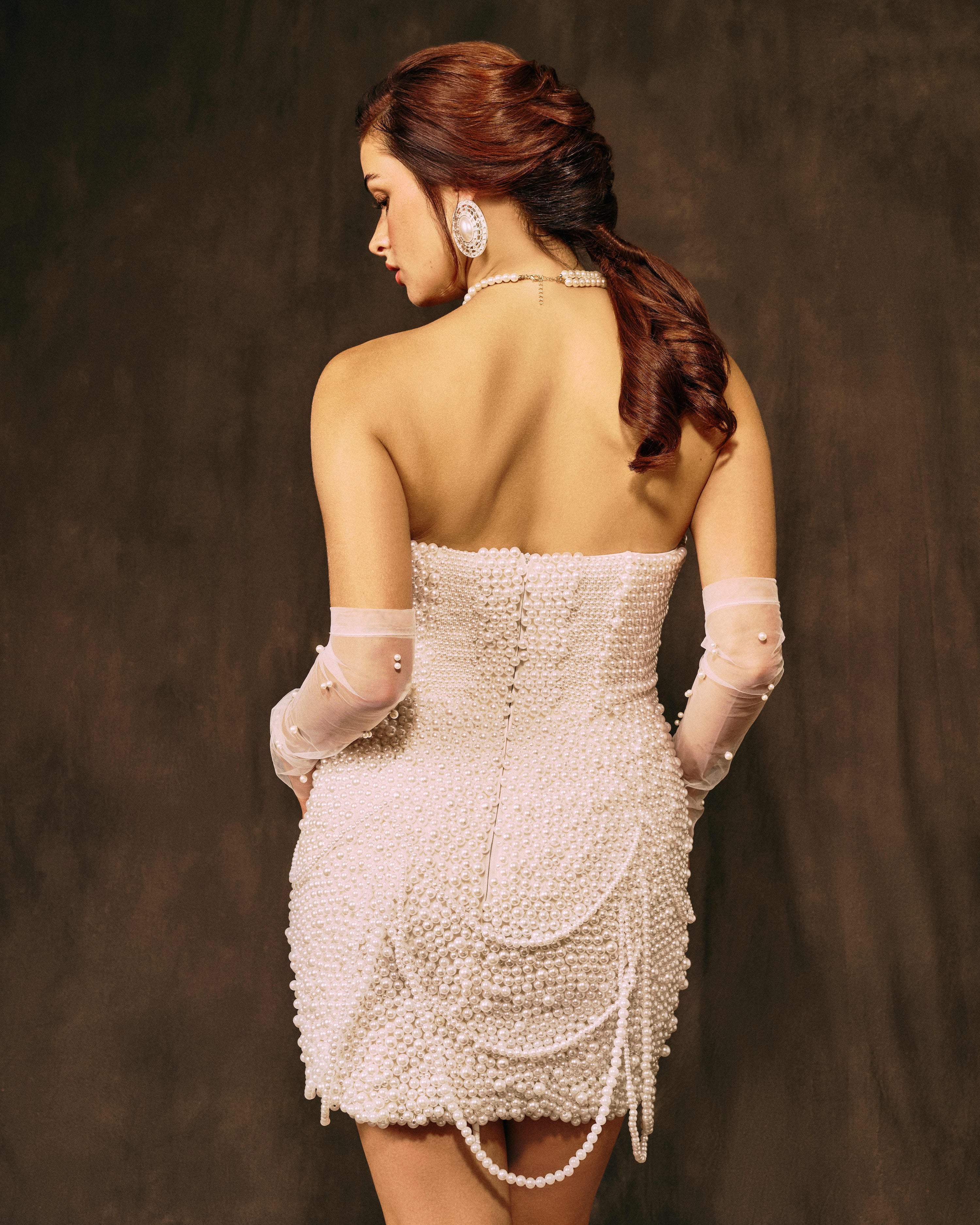 Elevate your bridal look with Pearla, an exquisite hand-beaded pearls mini dress designed for the unforgettable trendsetter. This show-stopping piece features our signature discrete corset, sculpting your silhouette with subtle elegance. Perfect for the bride who wants to make a lasting impression, Pearla allows you to effortlessly transition from ceremony to celebration. Its intricate craftsmanship and refined design let you shimmer as you dance the night away, creating unforgettable memories with confidence and grace. Celebrate your special day in a dress as unique and sophisticated as you are.
