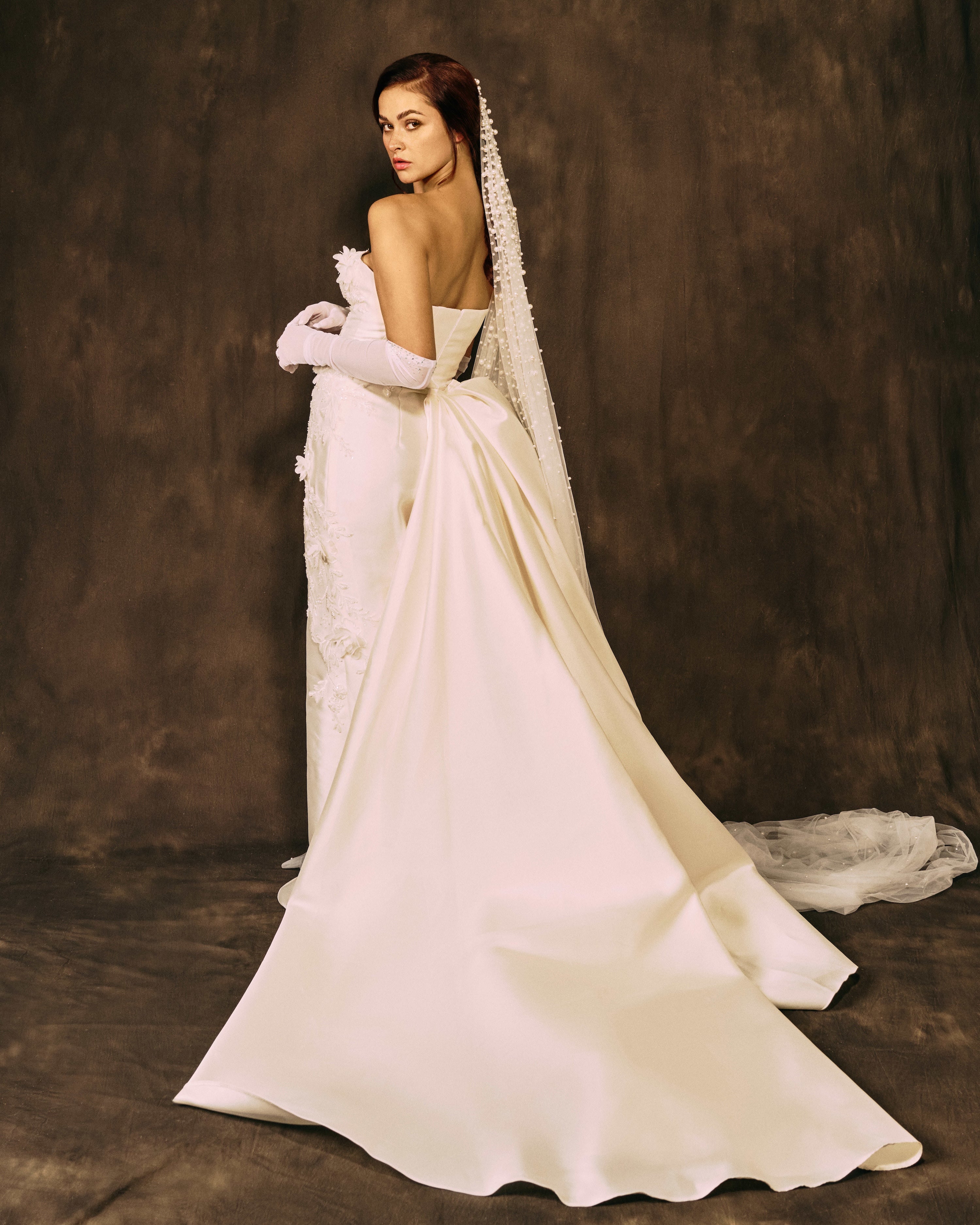 SOPHIA is an elegant straight-cut strapless gown distinguished by intricate 3D flower embroidery along the side, adding a delicate yet striking detail. The attachable train with hip volumes offers versatility, allowing you to customize your look to perfectly suit each moment of your celebration. Crafted from breathable silk fabric, this gown ensures comfort throughout your special day while the discreet corset and adjustable cups provide subtle support and a flattering fit. SOPHIA combines refined craftsmanship and modern design to create a sophisticated silhouette that enhances your natural grace with effortless charm.