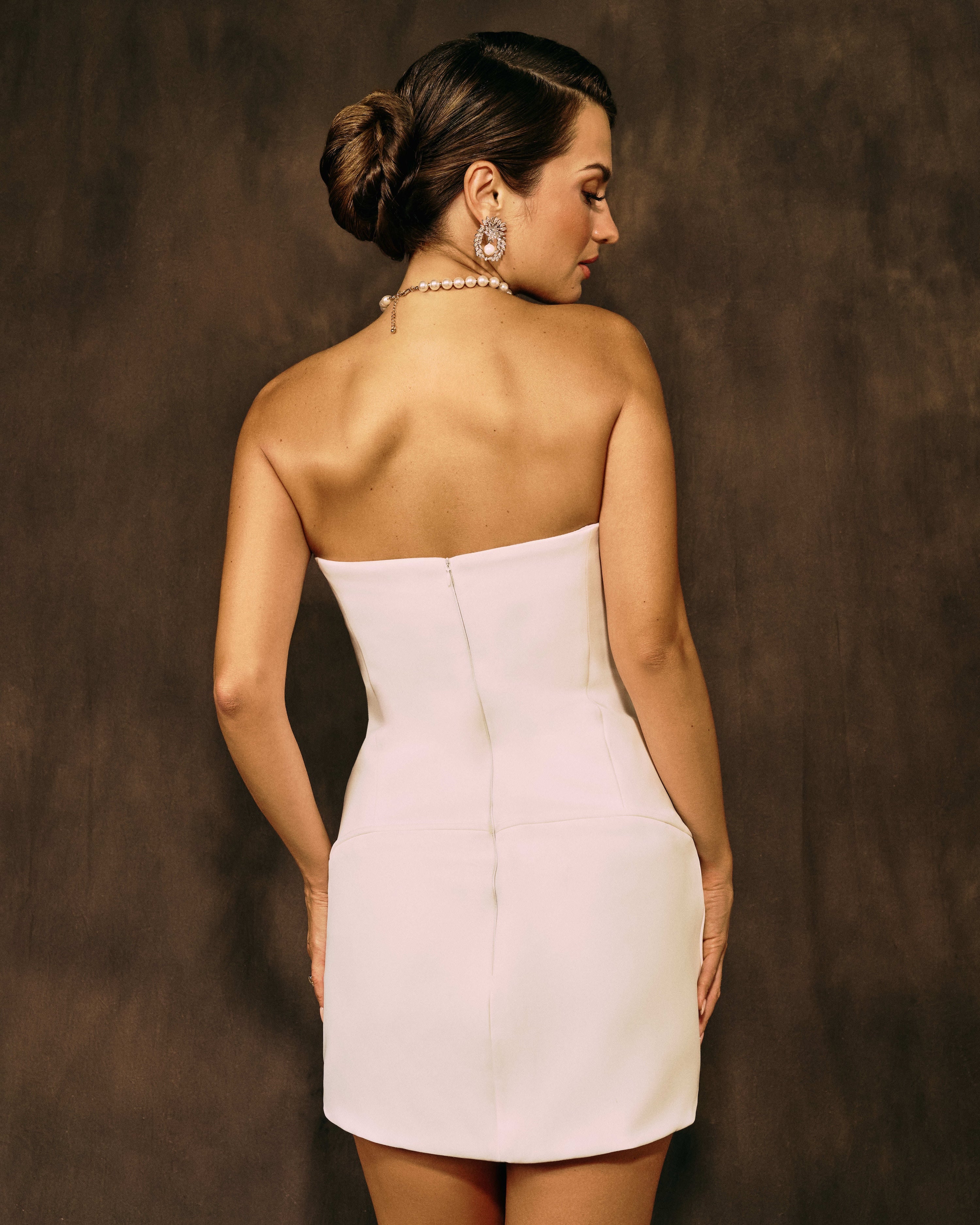 This elegant mini dress features a structured corset that enhances your silhouette with timeless sophistication. Adorned with removable asymmetrical pearl necklaces and crystal embellishments, it effortlessly channels an old Hollywood vibe while offering two distinctive looks in one ensemble. Perfect for bachelorette parties and receptions, this dress combines classic glamour with modern versatility, ensuring you make a memorable impression at every event. Its refined design and luxurious details elevate your style with grace and poise.