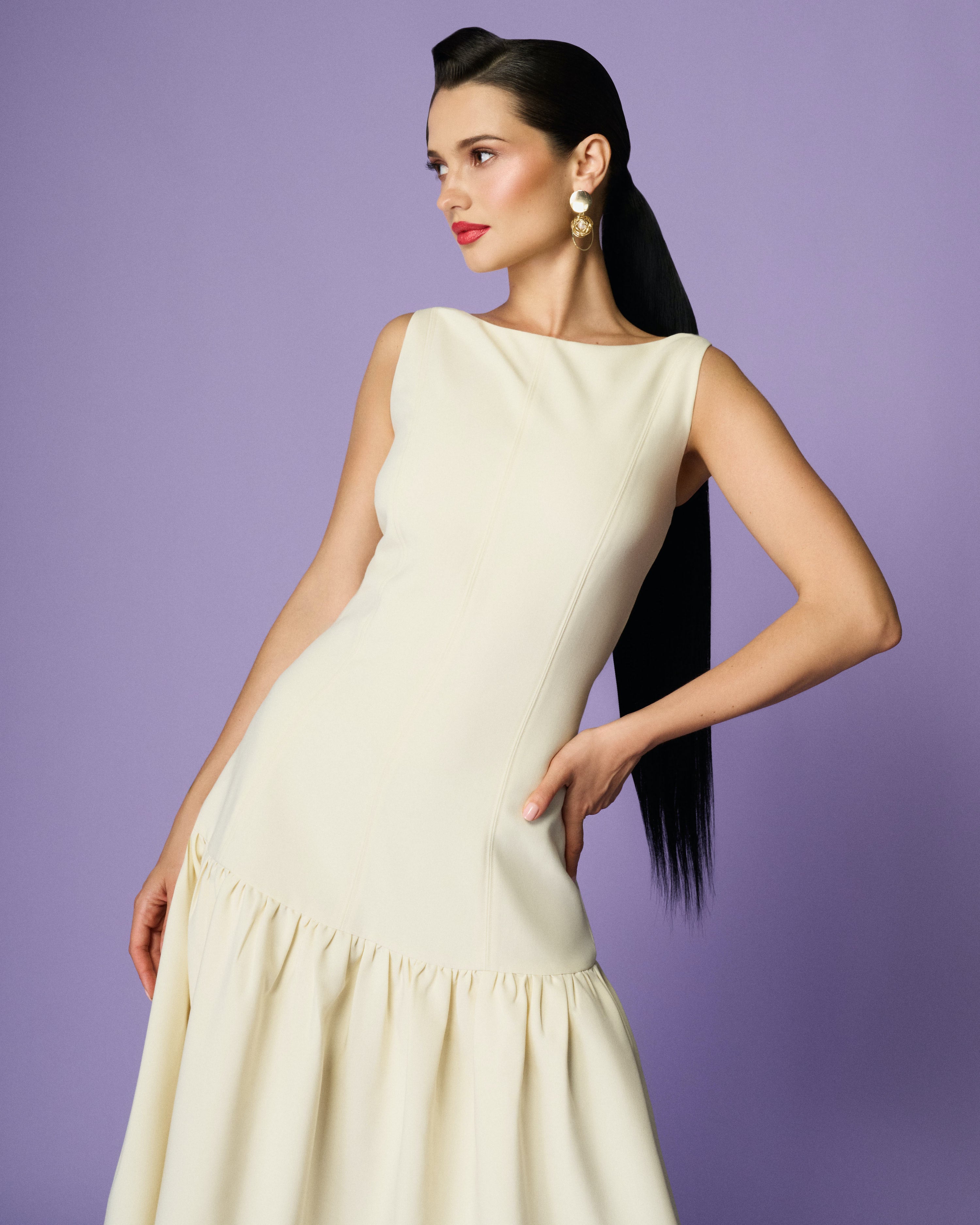 Get ready to turn heads and make hearts skip a beat with this delightfully charming cream dress. From the front, it exudes classic elegance with its simple, sleeveless design and gracefully gathered skirt. But wait until you see the back – a playful surprise awaits! The daring open back is accented with a whimsical bow that adds a flirtatious touch, making you feel like a present waiting to be unwrapped