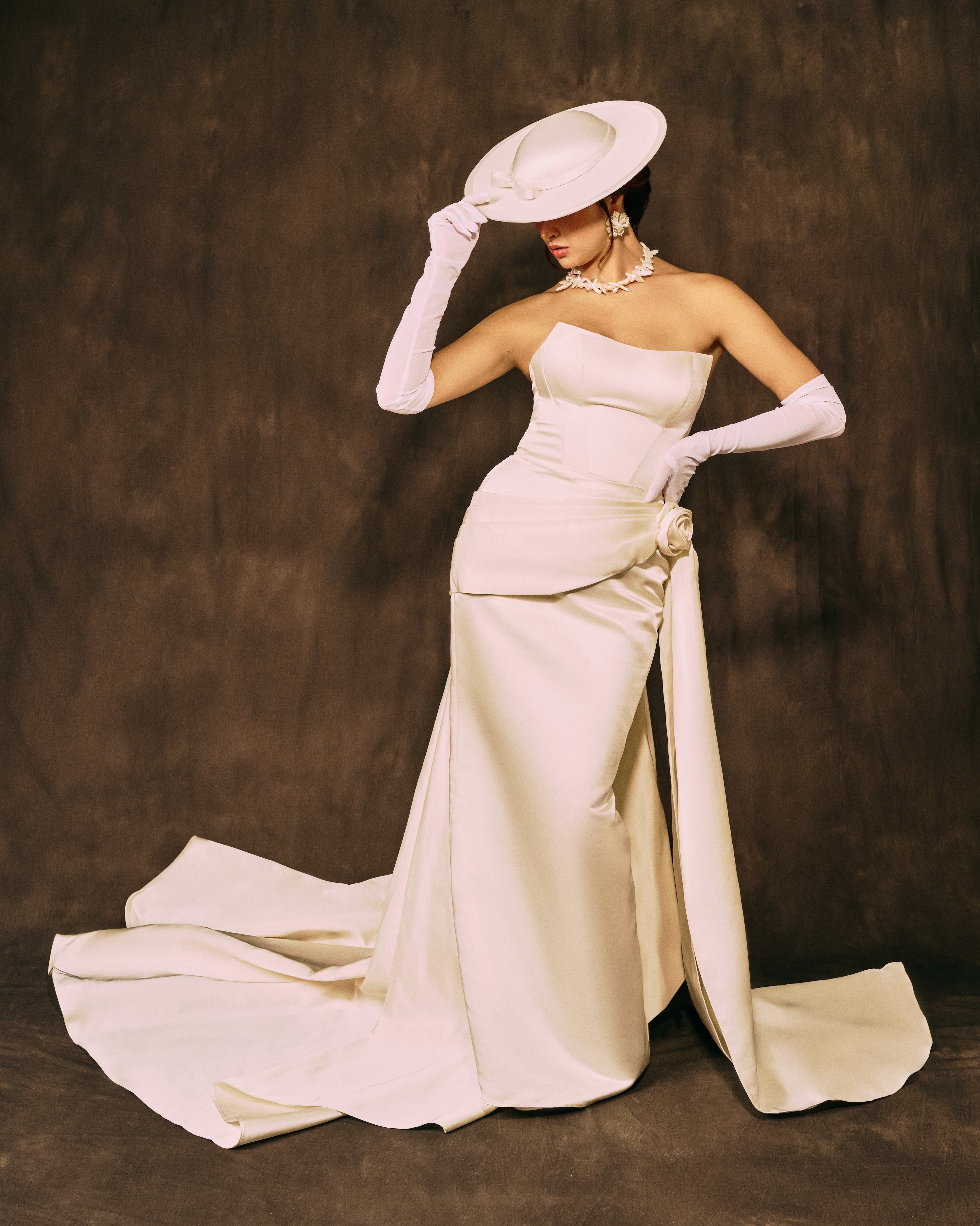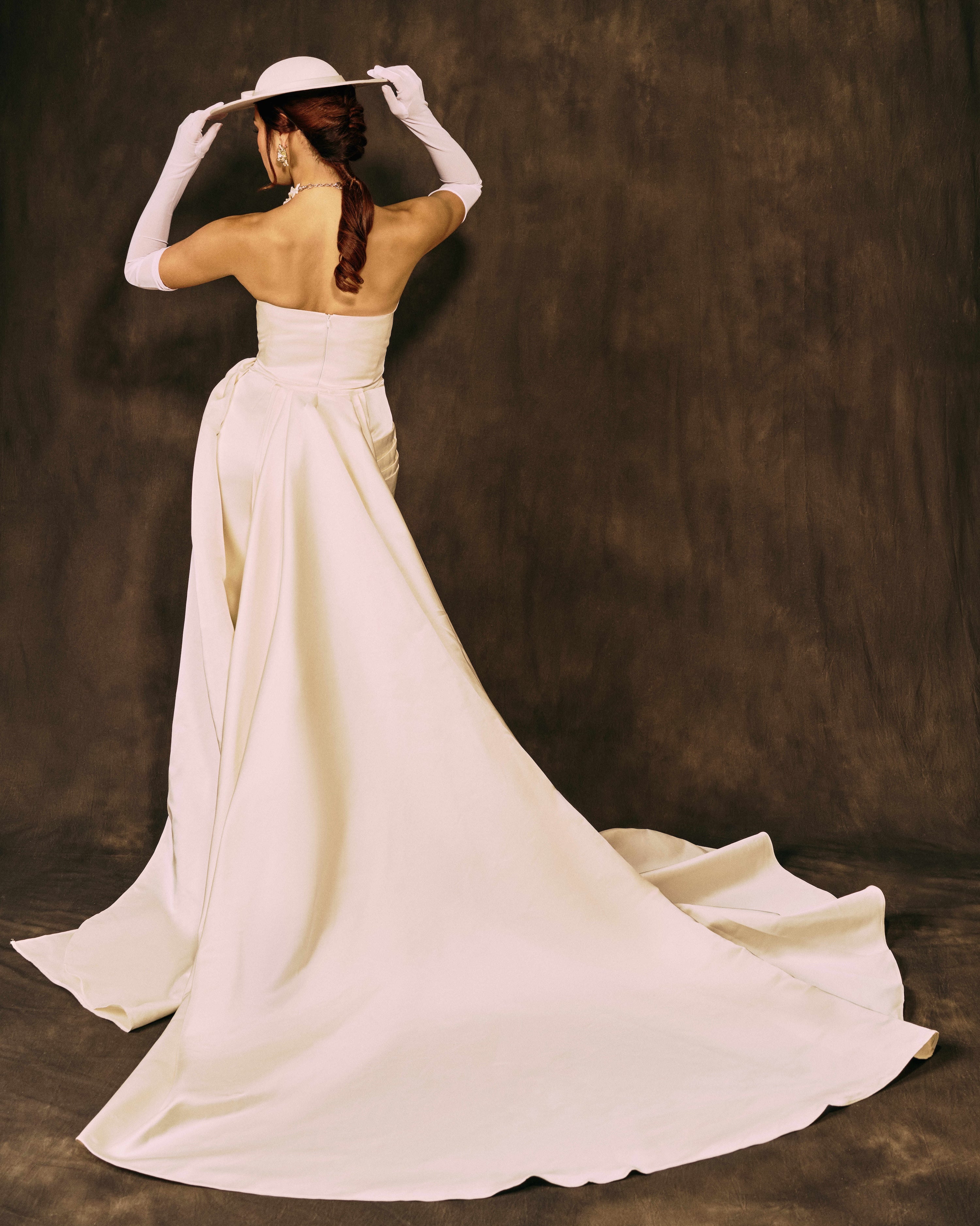 ROSALINA is the ultimate blend of distinctive elegance and timeless appeal, designed to showcase a striking hourglass silhouette with a subtle, modern rose-inspired twist. This exquisite piece offers versatility through its attachable train, allowing you to effortlessly switch between two stunning looks—ideal for both your ceremony and reception. Crafted to ensure you feel confident and radiant, ROSALINA elevates your special day with seamless sophistication, promising you a graceful transition from vows to celebration and a truly unforgettable happily ever after.