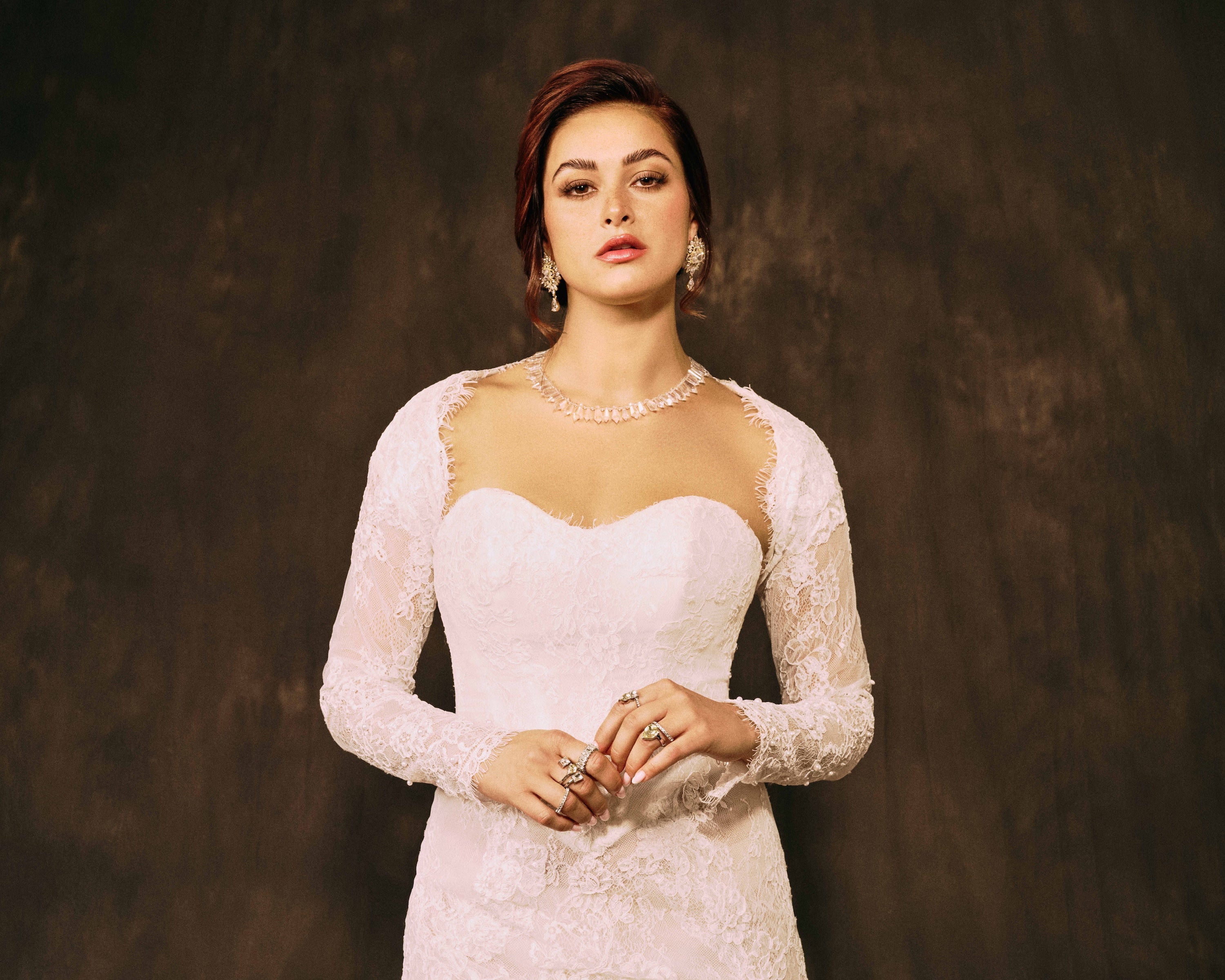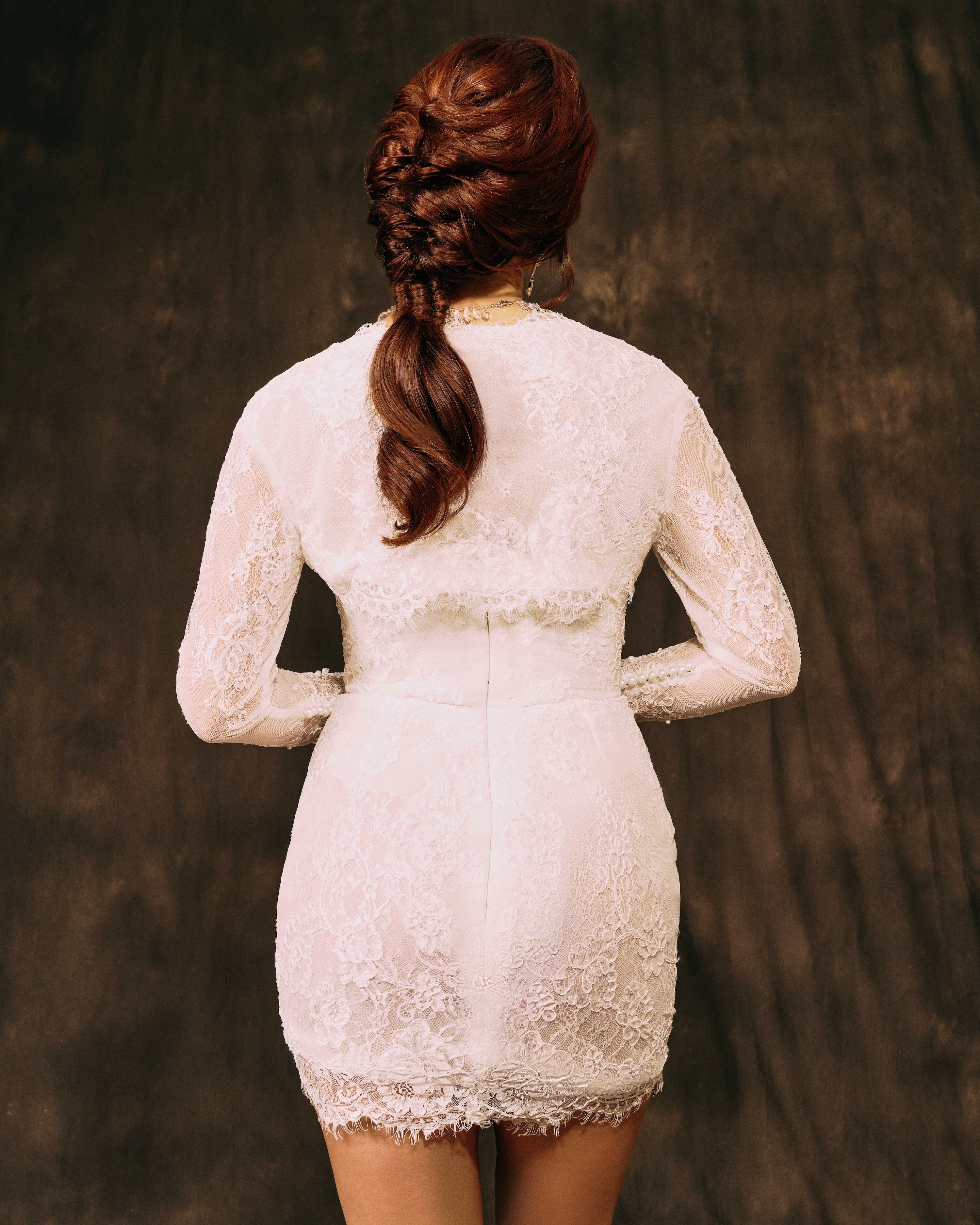This elegant mini dress features delicate French lace with a discreet mabrook corset structure for a flawless fit, complemented by a bolero that adds a touch of romance.