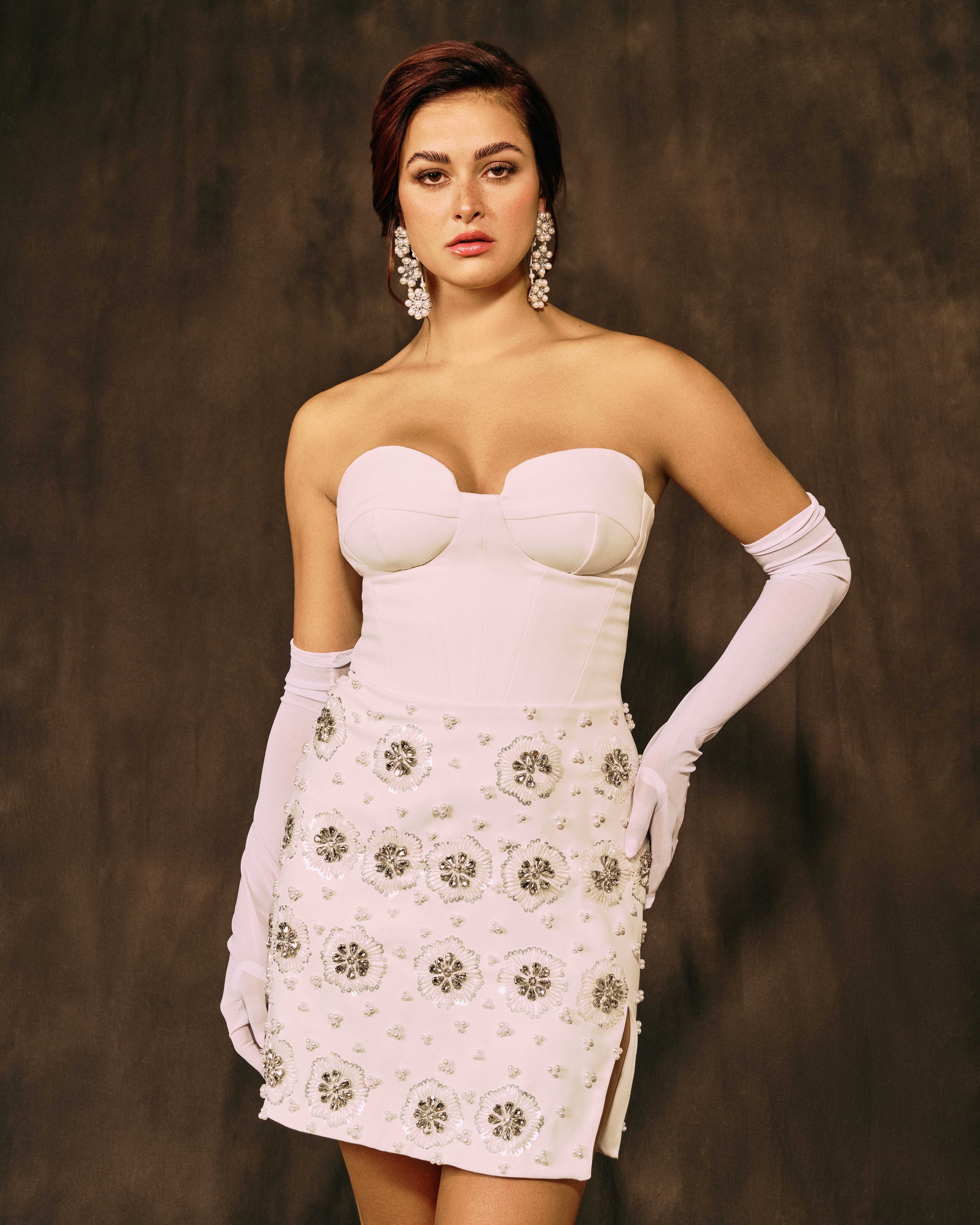 TINA is designed for the bride who desires both comfort and glamour on her special day. Featuring our signature discreet corset, it effortlessly sculpts an hourglass figure while providing elegant support. The stretchy fabric adapts to your shape, creating a sleek, hugging skirt silhouette that moves gracefully with you. This refined blend of style and comfort ensures you feel confident and poised from the first step down the aisle to the last dance of the evening. TINA is the perfect choice for a sophisticated bride who embraces beauty without sacrificing ease.