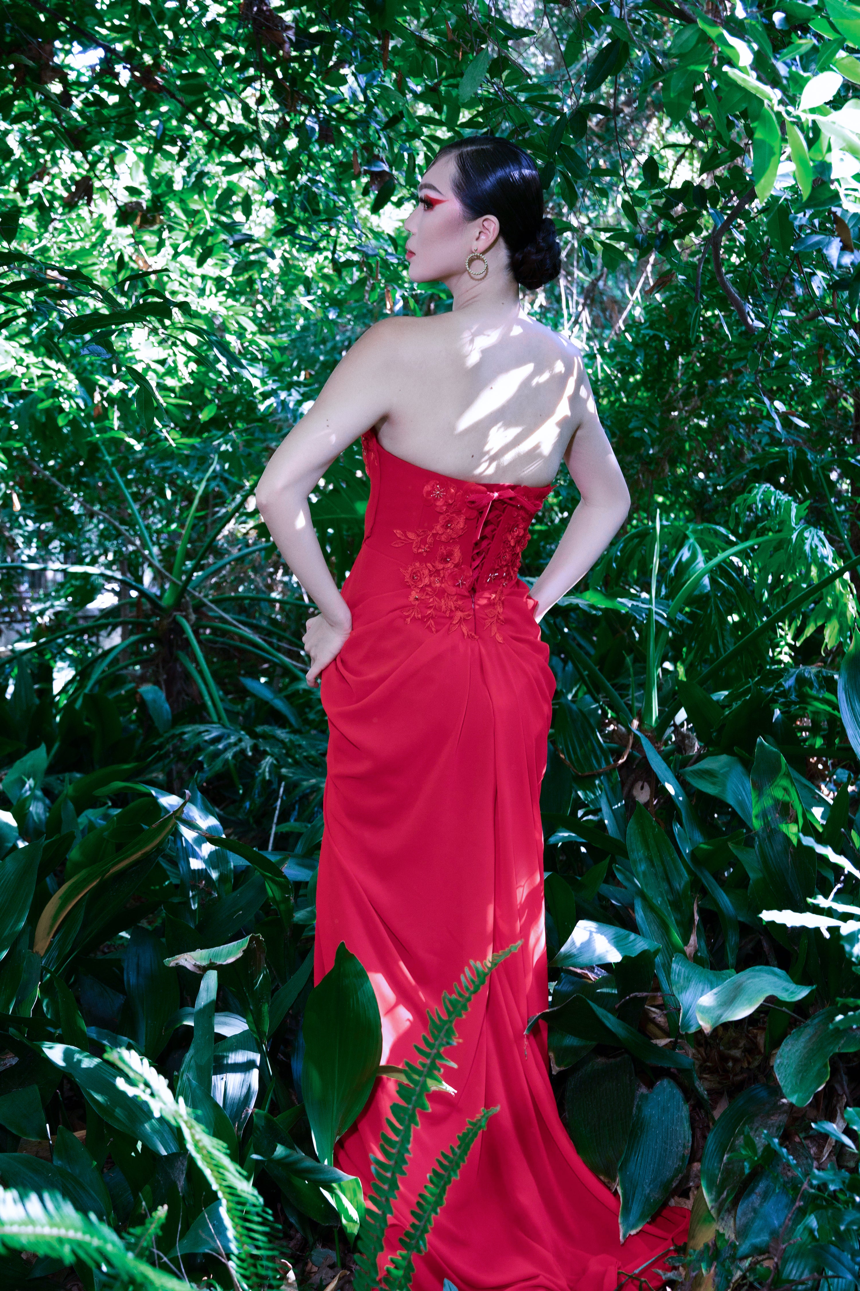 Set the scene ablaze with this hand-crafted fire red maxi dress. With intricate embroidery on the bodice and a corset enclosure, you'll feel like the star of the show. The draped chiffon skirt creates an hourglass effect, making you the leading lady. It's time to step into the spotlight.