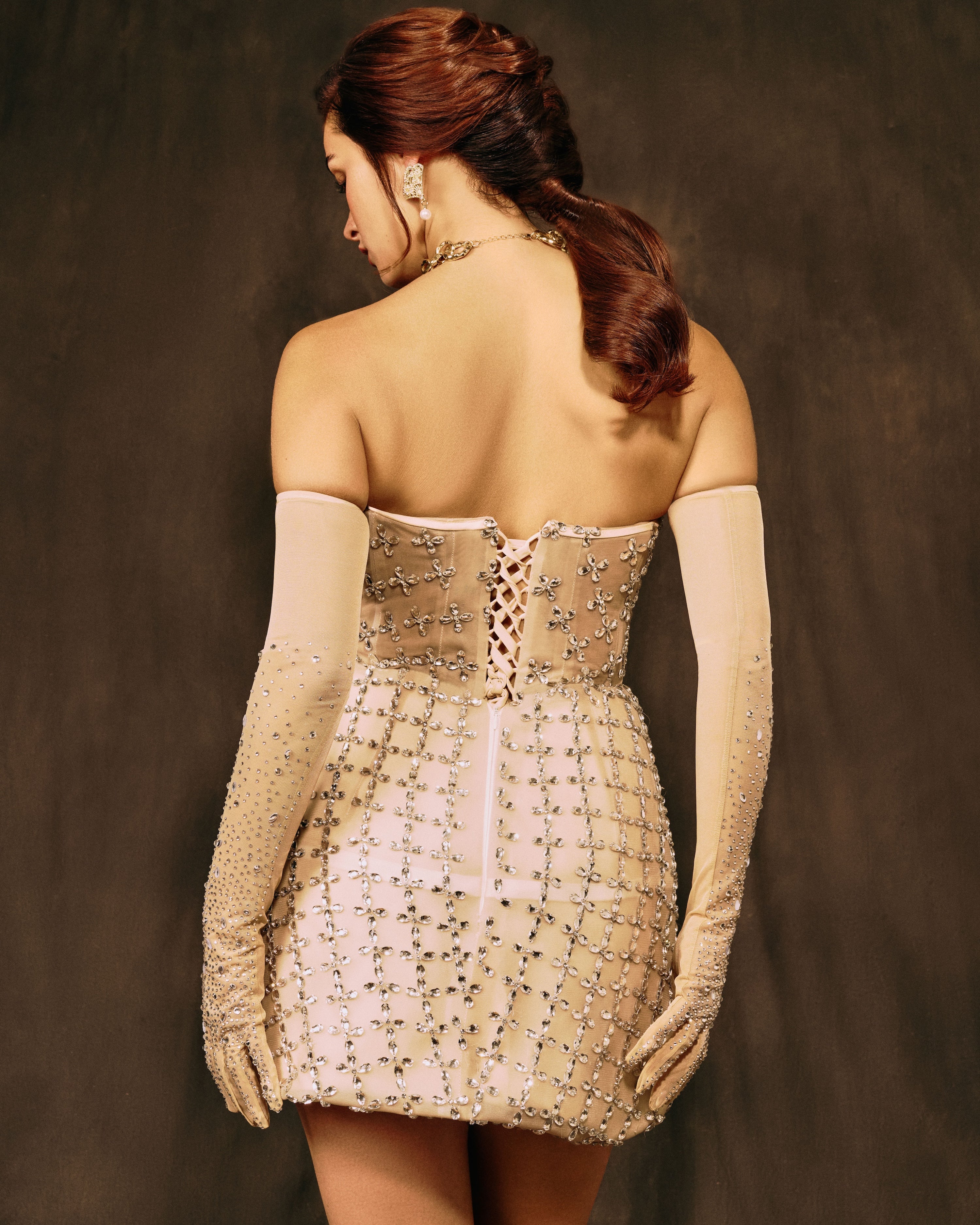 NADINE lets you shine like a radiant diamond in a mini organza dress that beautifully complements all skin tones. Expertly structured with boning, it provides a flattering silhouette enhanced by delicate flower-patterned crystals that catch the light with every movement. The elegant corset enclosure offers subtle support and shapes your figure with sophistication. Perfect for the bride seeking a refined yet eye-catching look, NADINE blends intricate details and modern design to create a memorable presence on your special day. Embrace elegance and sparkle with every step you take.
