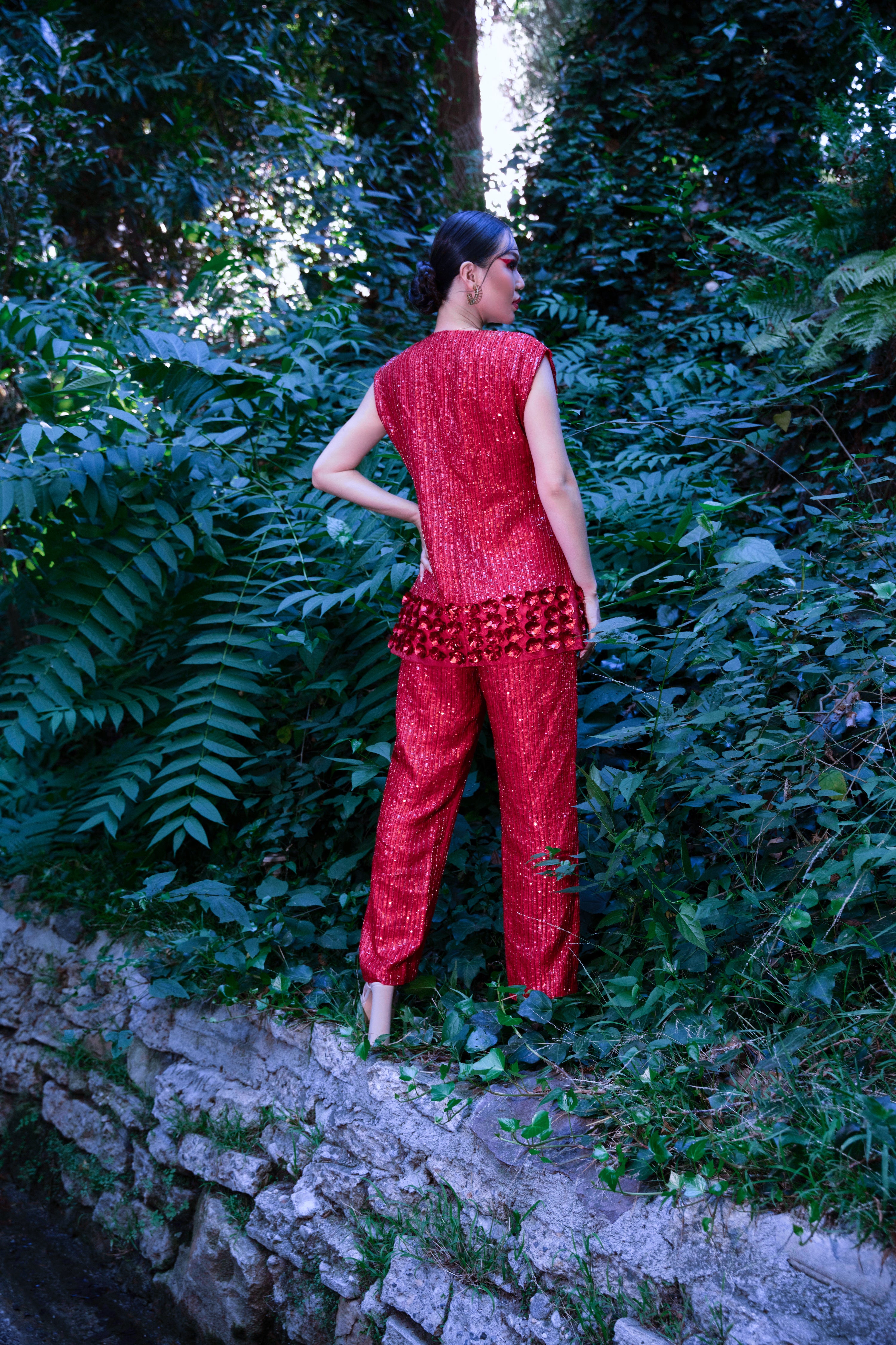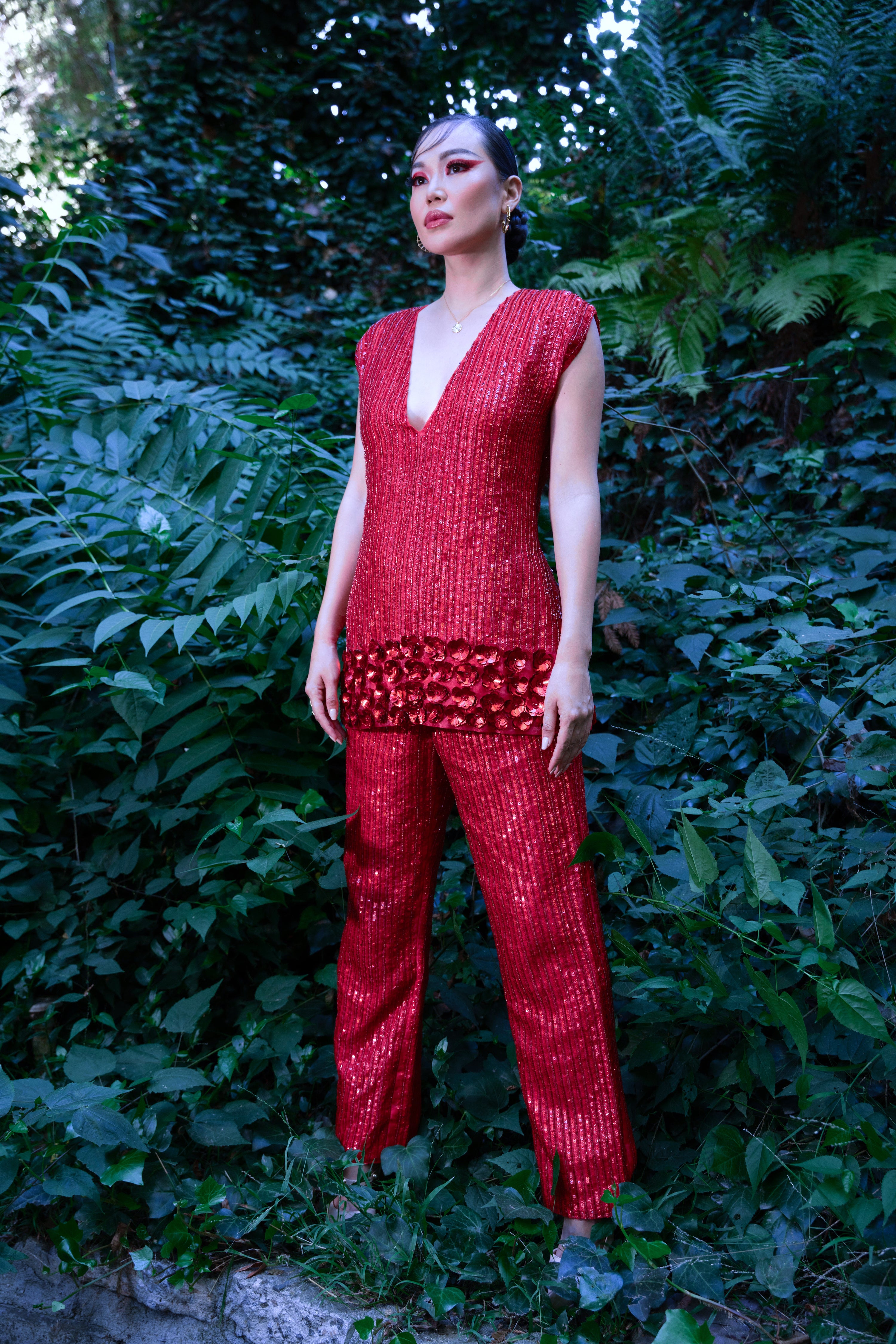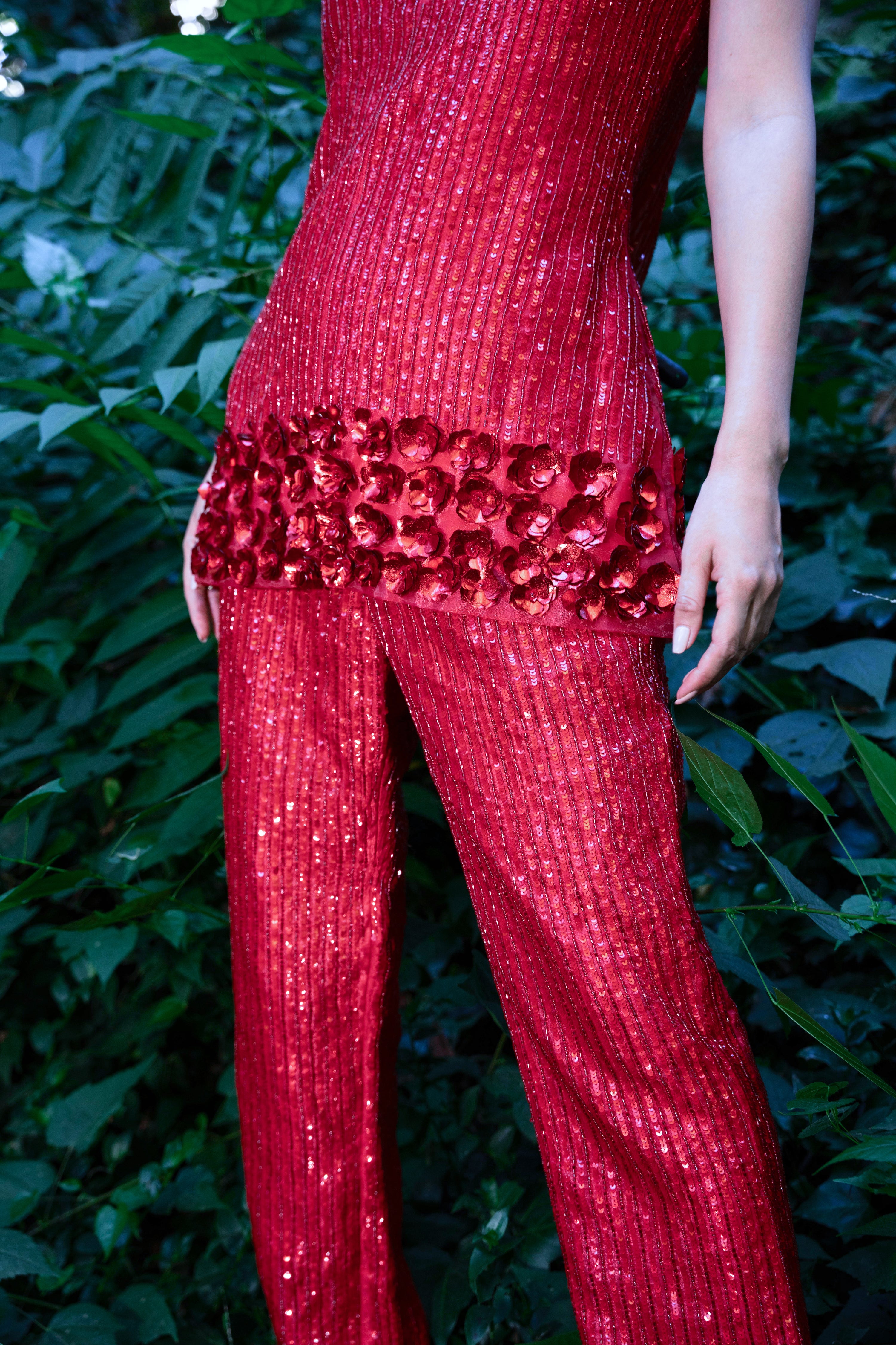 Indulge in luxury with the Zahara Set. Hand beaded and adorned with delicate flower sequin trim, this set exudes sophistication. The deep V-neck top and high-waisted pants with a side zipper offer a flattering silhouette. Fully lined for comfort and quality. Elevate your wardrobe with this exclusive set.